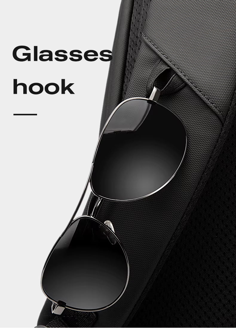 Multi-use curved shoulder straps with a built-in card pocket and glasses holder, breathable ergonomic back padding, polyester lining, and an integrated USB charging port complete a premium urban backpack that reinvents the standard for work, school, and travel functionality — all at just 1.18 kg and 30 × 18 × 43 cm.