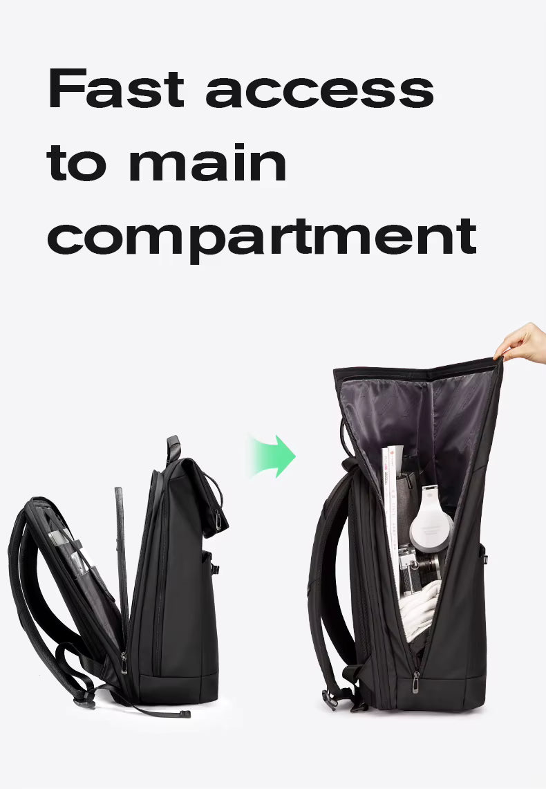 The innovative roll-top design expands effortlessly from 20 liters for streamlined daily use to a generous 30 liters for travel and weekend trips, with a verified 24-liter optimal carry capacity — while a dedicated padded compartment safely houses a 15.6-inch laptop alongside a 12.9-inch iPad and A4 documents with shock-absorbing protection. A large main opening makes packing clothes and gear effortless and intuitive, while front and side pockets keep power banks, water bottles, and quick-access essentials instantly reachable.